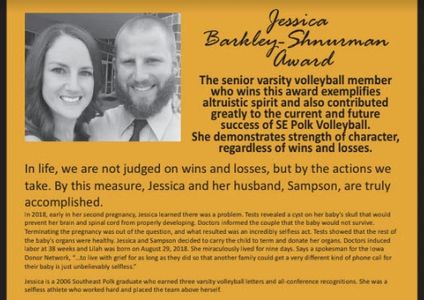 The senior varsity volleyball member who wins this award exemplifies altruistic spirit and also contributed greatly to the current and future success of SE Polk Volleyball. She demonstrates strength of character, regardless of wins and losses.